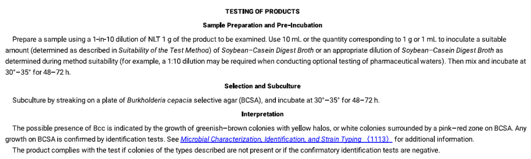 最開(kāi)始,洋蔥伯克霍爾德菌并未被列入USP的控制菌檢查范圍內,它對藥品的潛在威脅性是在20189月底舉行的PDA/FDA會(huì )議中被提出。目前,USP<60> MICROBIOLOGICAL EXAMINATION OF NONSTERILE PRODUCTSTESTS FOR BURKHOLDERIA CEPACIA COMPLEX已于2019121日生效,正式將洋蔥伯克霍爾德復合體納入了USP控制菌檢查項目。